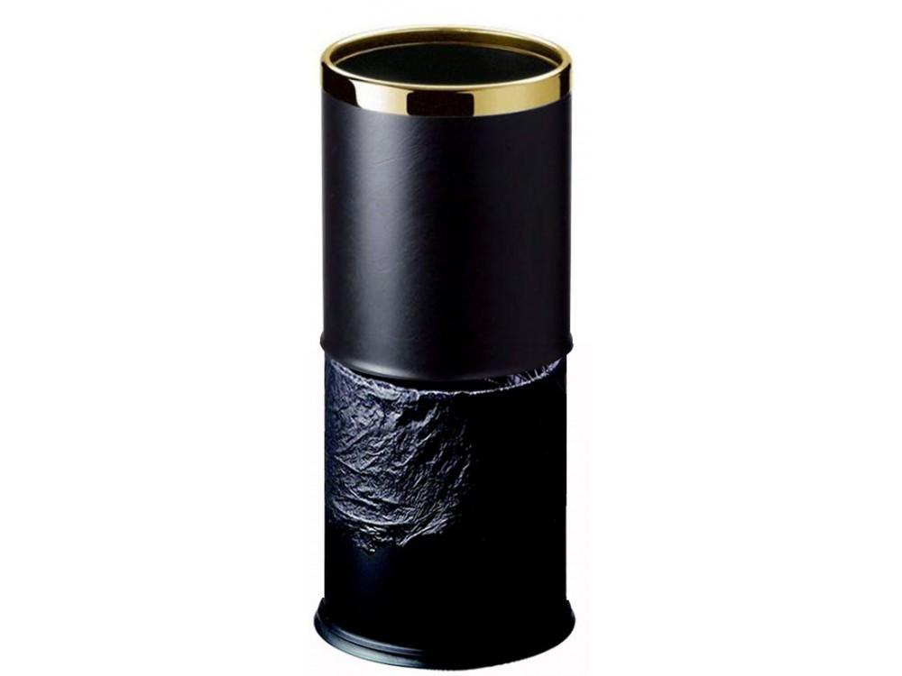 Doppelwandiger Zimmerkorb mit schwarzem Kunstleder als Außenhülle und schwarz lackiertem Stahl als Innenhülle. Der Korb enthält außerdem einen "unsichtbaren" inneren Plastikbeutel, einen goldenen oberen Rahmen und einen Stoßboden.