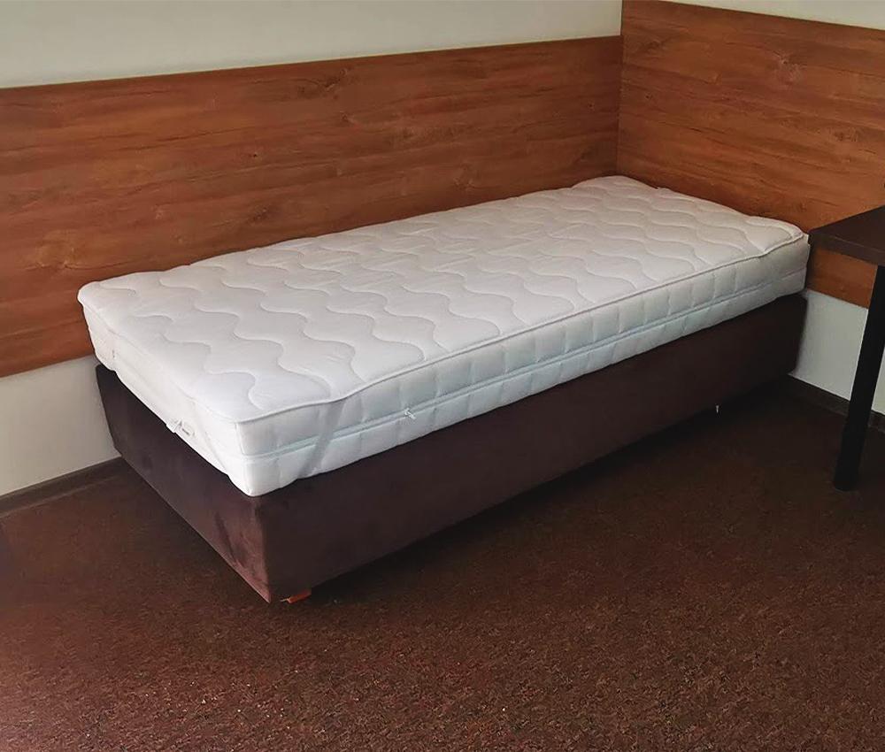 Die Boxspring-Hotelbetten mit festem Kopfteil zeichnen sich durch ihr hochwertiges Design aus und haben folgende Grundparameter: die Bettkonstruktion ist aus hochwertigem DTD mit einer Stärke von 18 mm, der Bettrahmen ist aus massiver Fichte gefertigt, die Liegefläche des Bettes ist aus massiver Platte, das Bett kann mit zwei Arten von Stoffen (Florida oder Kaschmir) oder mit dem eigenen Stoff des Kunden gepolstert werden, die Gesamthöhe des Bettes beträgt 37 cm (ohne Matratze), das Bett ist mit 2 Stück massiven Buchenholzfüßen und 2 Stück Rollen ausgestattet. Der unbestreitbare Vorteil der Bettpolsterung ist, dass der Bezug mit einem Reißverschluss ausgestattet ist, der einen einfachen Austausch ermöglicht. Der Bezug ist im Bereich der Matratzenablage aus rutschfestem Stoff gefertigt, der ein Verrutschen der Matratze verhindert. Die Matratze ist nicht im Lieferumfang des Bettes enthalten und die Preise der Hotelbetten werden ohne Matratze angegeben. Das Foto des Boxspringbetts dient nur zur Veranschaulichung.