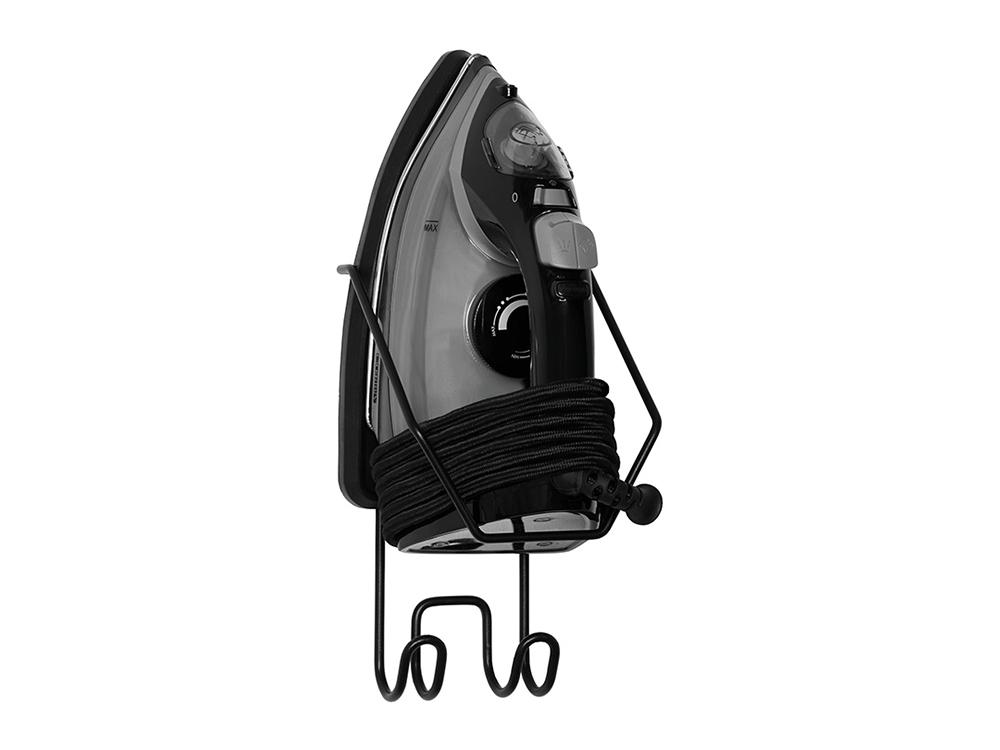 Bügeleisenhalterung mit schneller und einfacher Wandmontage. Eine hitzebeständige Unterlage, die Schäden an der Grundplatte verhindert und die Wärme absorbiert.